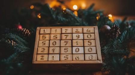 A beautifully crafted vintage wooden number puzzle set lies on a rustic table adorned with Christmas decorations and soft warm lights, evoking festive cheer.