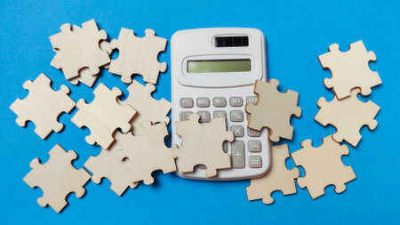 Financial Puzzle Solved: White Calculator Surrounded by Wooden Jigsaw Pieces on a Bright Blue Background, Illustrating Complex Accounting, Budgeting, and Business Strategy.