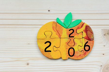 A wooden apple puzzle with the numbers 2026