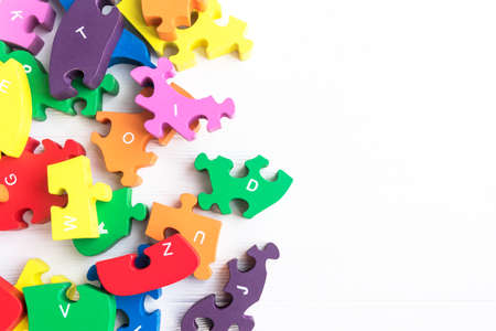 Colorful puzzles on a white background with space for text. International Puzzle Day.
