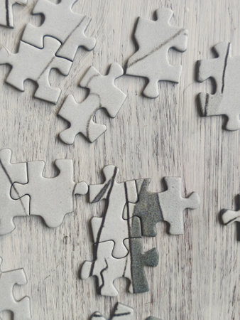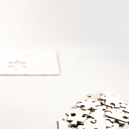 Closed up shot of blank white puzzle pieces, selective focus, copy space for text