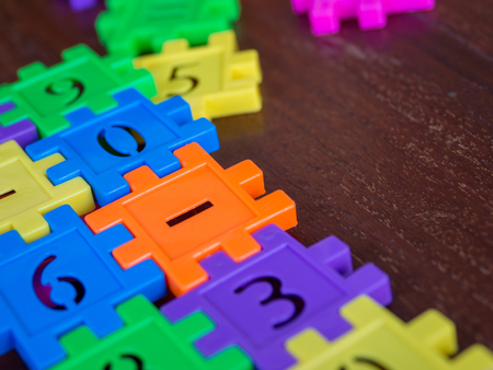 colorful puzzle Jigsaw plastic number on the wooden table. Concept of education and math learning