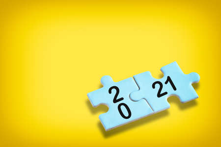 New year 2021 on blue puzzle with shadow on yellow background, business success concept and challenge idea