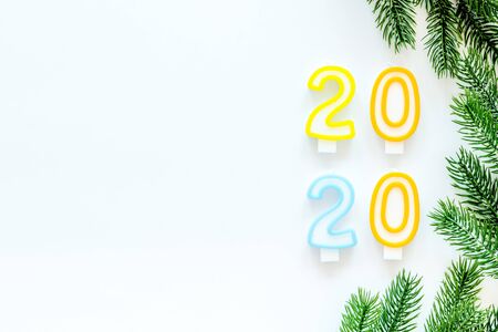 2020 New Year design. Date laid out by candles near fir branches on white background top view copy space frame