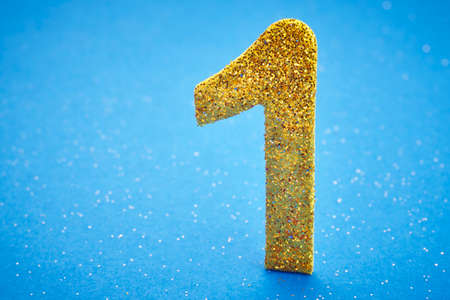 Creative layout. Golden foil balloon number and digit one 1. Birthday greeting card. Anniversary concept. Top view. Copy space. Stylish gold numeral over blue background. Numerical digit.