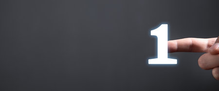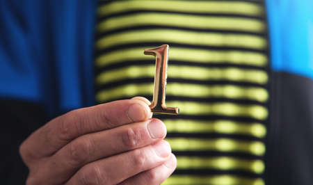 A close up shot of a man's hand holding number one gold winner first place 3d isolated