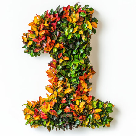 This artistic representation of the number one features an array of fresh green leaves and colorful flowers, perfect for celebrations or nature-themed events.