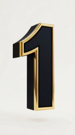 Number one in black with gold trim floats on a neutral background. Clean composition and high-contrast materials suggest luxury branding and editorial use. Isolated symbol with subtle shadow provides copy space for layouts