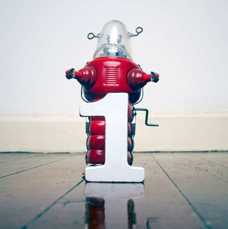 number one and a retro robot on a wooden floor toned
