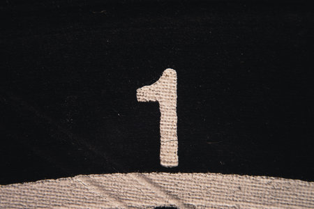 Close-up of black painted number of 1 on the grey textured wall.