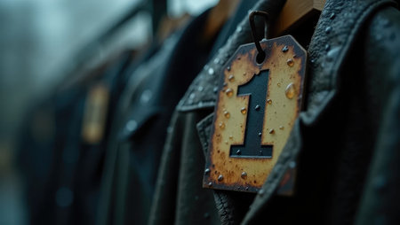 A weathered metal number tag hangs on a rusty hanger, raindrops adding a melancholic feel. Perfect for stories about school memories.