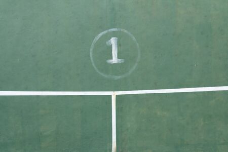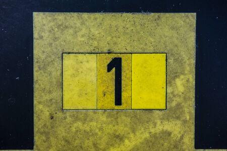 Detail of yellow number one on cracked rubber ground at garage