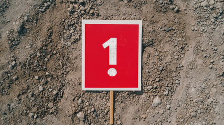 A red sign displaying the number 1 stands upright on a dirt surface, indicating a specific location or point of interest.