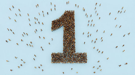 Numerous persons assembled together to shape numeral one figure signifying premier status, leading position, or significant milestone above.
