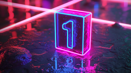 In an ultraviolet light, a number one glowing pink blue neon inside a square box