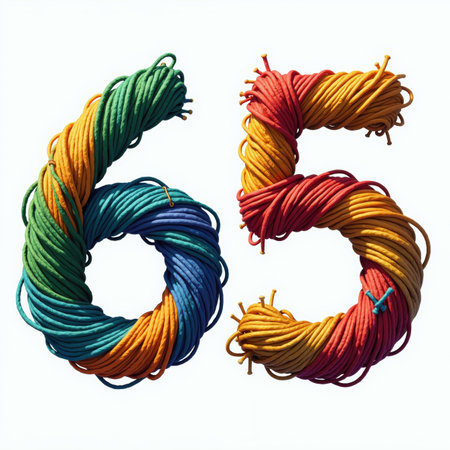Illustration for birthday card, number 65 made of colorful yarn, twisted and knotted, on white background.