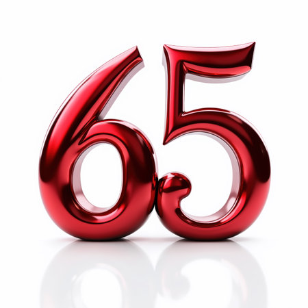 The number sixty-five is depicted in a metallic red finish, on a white background, as a birthday card illustration.
