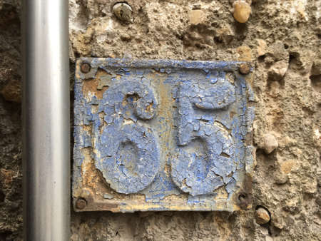 Rusty metal house number sixty fife (65)