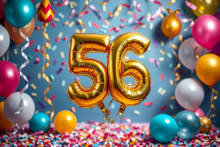AI Generative Helium birthday balloon shape number fifty six, golden letter figure 56 celebration festive background decor