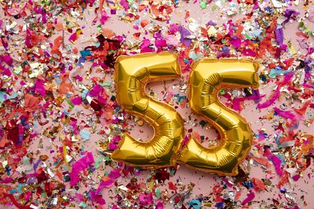 Number 55 gold birthday celebration balloon on a confetti glitter background