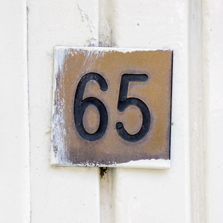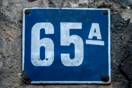 Weathered grunge square metal enameled plate of number of street address with number 65 A