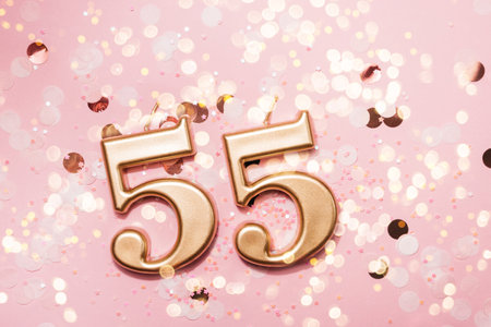 Number 55 fifty five golden celebration birthday candle on Festive Background. fifty five years birthday. concept of celebrating birthday, anniversary, important date, holiday
