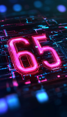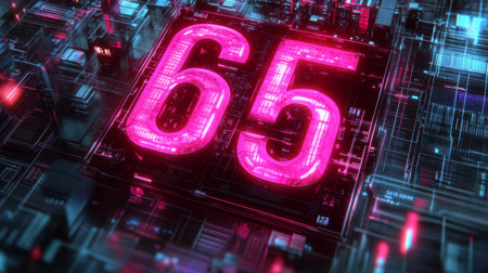 Neon Number 65 on Motherboard Background 3D Render Illustration Background With Copy Space.