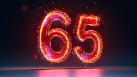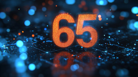 Glowing Digital 3D Number 65 in Futuristic Style Against a Dark, Abstract Technology Background