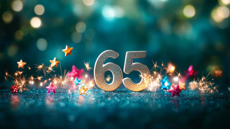 Brilliant 65 Metallic Numeral on Rich Teal Surface with Sparkling Stars and Joyful Fireworks