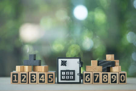 Miniature safe deposit with a code lock and wooden block number. Bank deposit and security concept