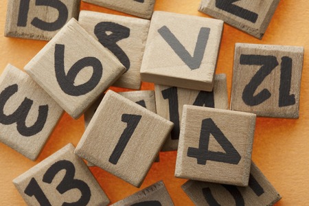 wooden numbers are randomly arranged on pink suede. High quality photo