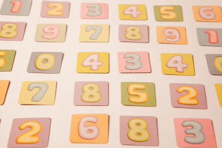 child kid colorful education toys cubes with numbers math pattern background on the bright background. Flat lay. Childhood infancy children babies concept.