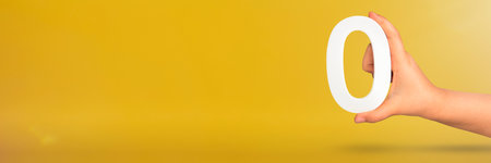 Numeral zero in hand. A hand holds a white number zero on a yellow background with copy space. Zero concept, 0 percent interest rate, minimum air emissions, cost or credit no increase.