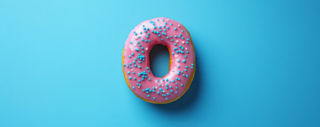 A pink doughnut with sprinkles on it that is shaped like the letter O. The doughnut is colorful and has a fun, playful vibe