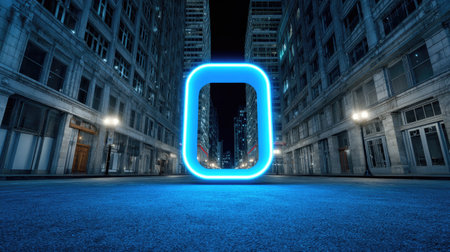 A 3D rendered metallic letter O with a polished chrome finish. It is illuminated by a vibrant blue neon light that outlines its edges, creating a glowing effect. The background is a smooth gradient of deep blue and purple, with subtle reflections on the surface below.