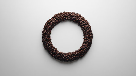 A visually striking top-down shot of roasted coffee beans arranged in a perfect circle, showcasing their rich brown color and texture against a clean background.