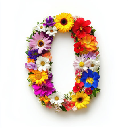 A vibrant floral wreath shaped like the number zero featuring an array of colorful flowers. Perfect for decorations, events, and creative advertising.