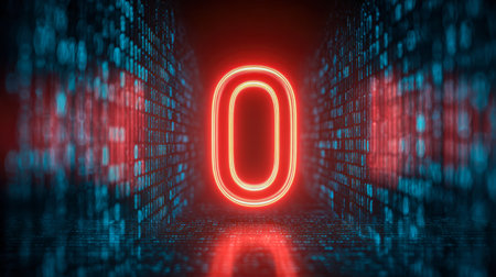 A luminous red zero pulse radiantly amid shadowy digital corridors, with streaming blue binary sequences illustrating dynamic data exchange in cyberspace.