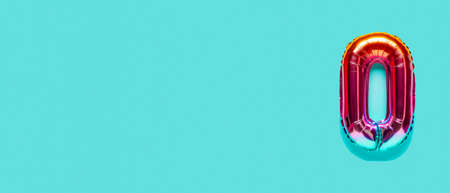 Rainbow foil balloon number, digit zero. top view. Colored numeral on blue background.