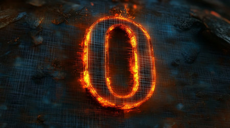 Glowing Burning Digital 0 In Futuristic Style On Metal Grille Abstract Background With Copy Space