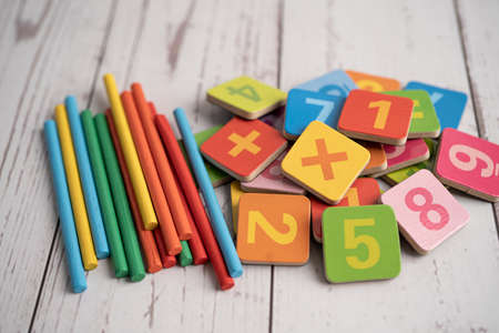 Number wood block cubes for learning Mathematic, education math concept.
