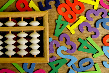 Education,business and finance concept for blog title and header. Top view of abacus with variety color of wooden numbers on wooden background.