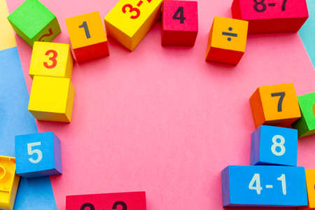 child kid colorful education toys cubes with numbers math pattern background on the bright background. Flat lay. Childhood infancy children babies concept.