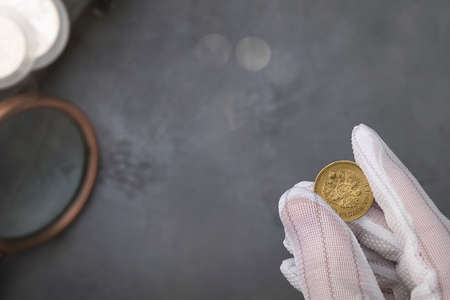 Numismatics. Old collectible coins of silver, gold and copper on the table. A collector in special gloves holds an old coin. top view.