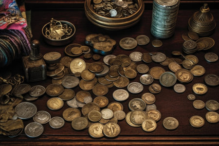 Assortment of vintage coins and trinkets scattered on an antique table, evoking history, nostalgia, and antique collecting.