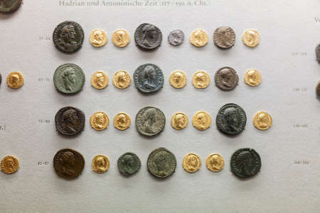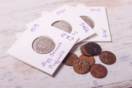 Numismatics. Old collectible coins on a wooden table. Dark background.