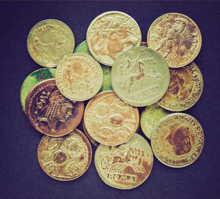 Pile of ancient silver coins with portraits, close-up macro shot, selective focus