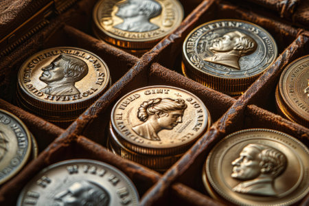 Step into the world of Vintage Euphoria and be captivated by the mesmerizing artistry found on historic coins and currency. This image transports you to another era, showcasing a magnificent collection of antique coins, banknotes, and precious metal tokens. Each item exudes its own unique charm and cultural significance, representing different time periods and civilizations. The diverse art styles featured include intricate engravings reminiscent of baroque masterpieces and bold illustrations inspired by traditional patterns. Prepare to be awestruck by the craftsmanship behind these antique treasures, evoking a wave of nostalgic fascination among viewers worldwide.