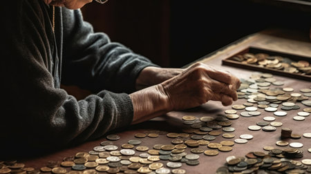 Close-up of an elderly woman's hand carefully counting coins on a rough surface, symbolizing frugality and economic hardship.