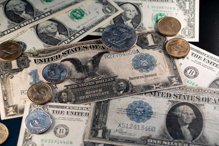 Coins of United States of America on a dark background. Selective focus. Toned.